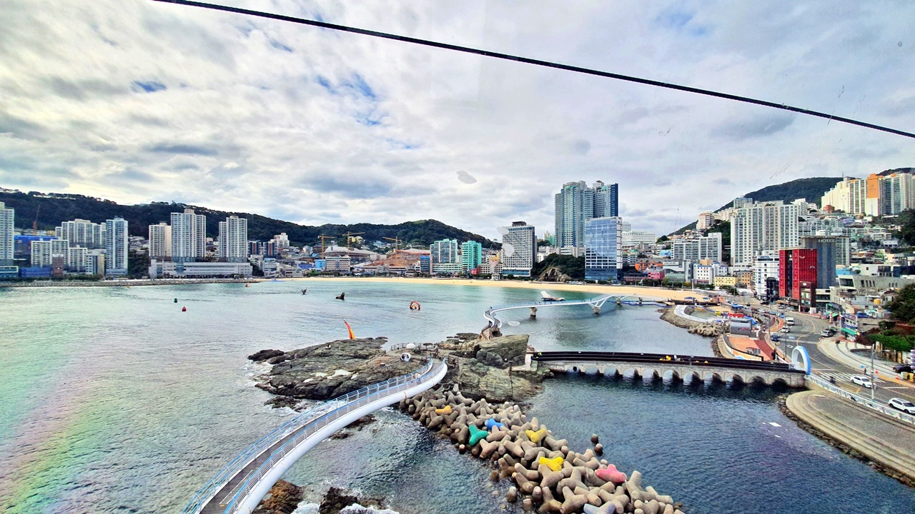 2017年6月にオープンした松島ケーブルカーは、全長1.62キロ、海面86mを進む海上ケーブルカーで、ビーチだけなく、海沿いにある散歩道や遠くにはチャガルチ市場や釜山タワーも見渡すことができ、釜山っ子にも人気のスポットです。床がガラス張りのケーブルカーもあり、海の上を飛んでいるような気分を味わうこともできます。